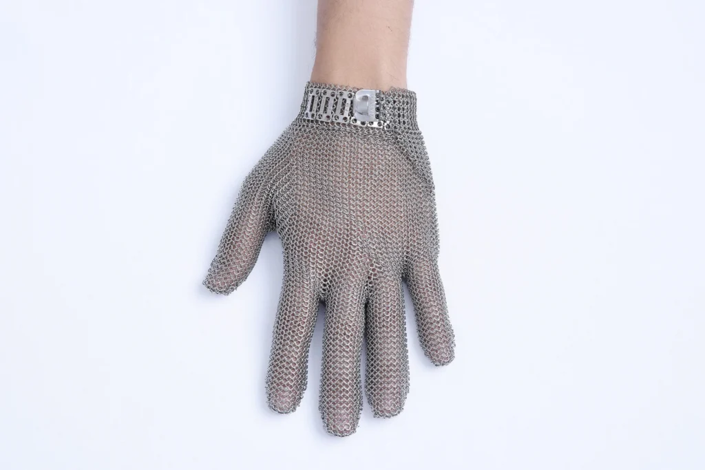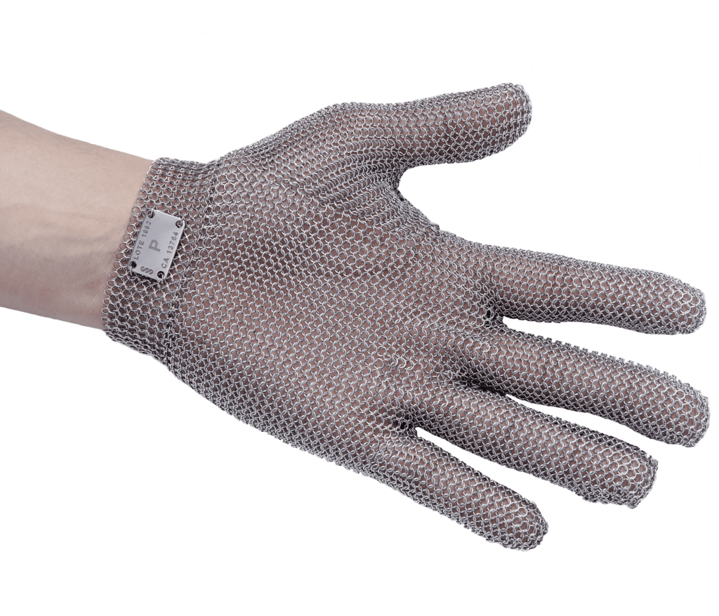 Luva de segurança confeccionada em malha de aço, fio inox 304L – 0,55 mm de diâmetro. Luva 100% em inox com sistema de fechamento através de travas e ganchos. Luva Ambidestra (pode ser utilizada em ambas as mãos).